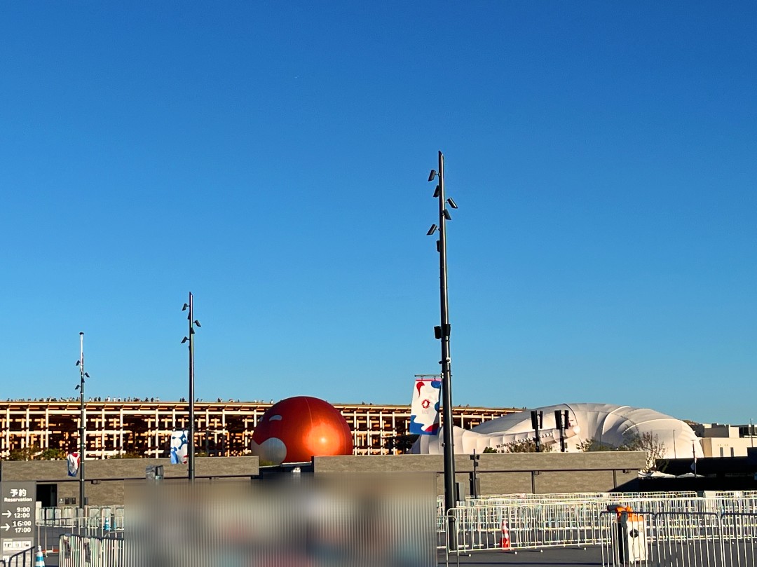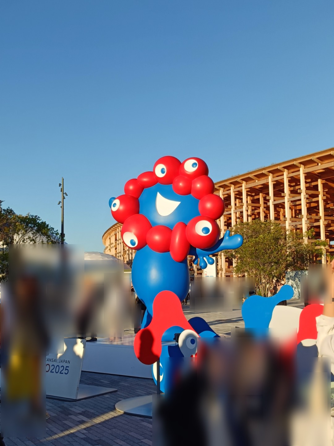 でもせっかくなので、万博来た感は少しあった方がええかなぁと思い、大屋根リングをバックにミャクミャクを撮っときました笑