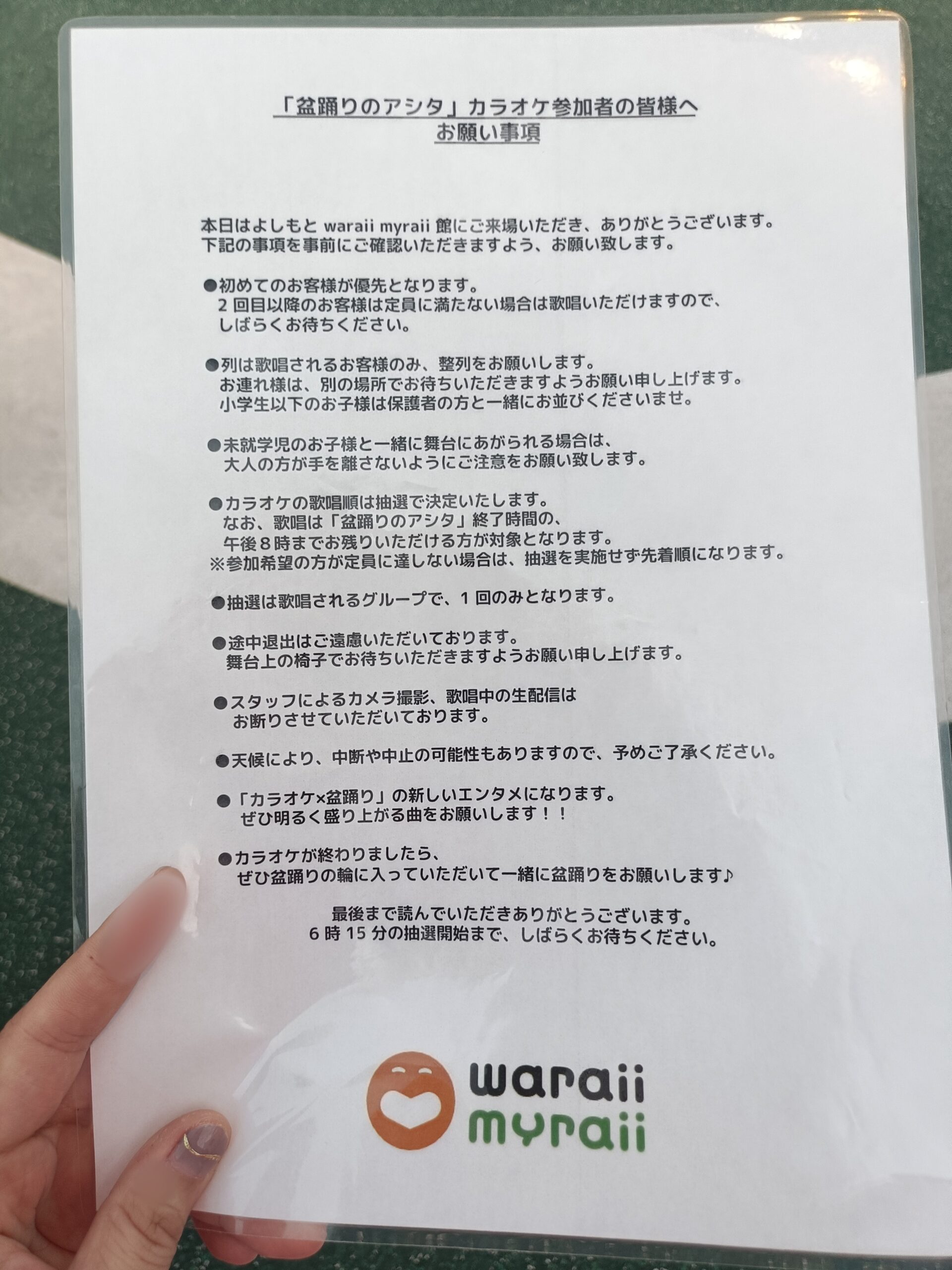 ゲームとかもあったんですが、時間がなかったのでスルーして、カラオケ盆踊りの応募をするために並びました。