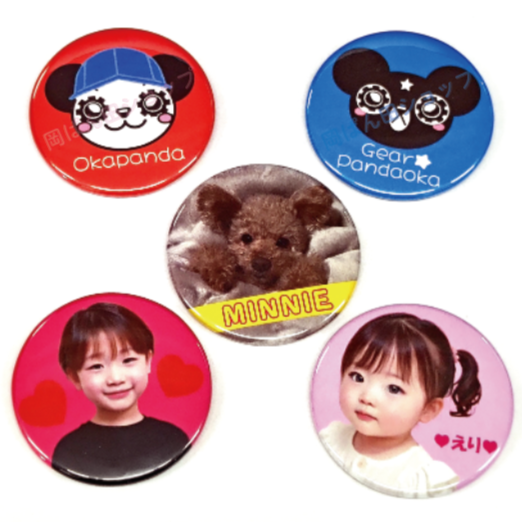 見本として、岡ぱん田やら子どもの写真を使った缶バッジを作ってもらったんですが、可愛らしいですよね♪